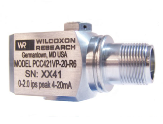 威爾康森4-20mA回路供電振動傳感器PCC421VP-20-R6型,側出口,105°C,4-20mA,每秒2.0英寸滿量程測量范圍,滿量程±5%容差,與峰值速度成正比。