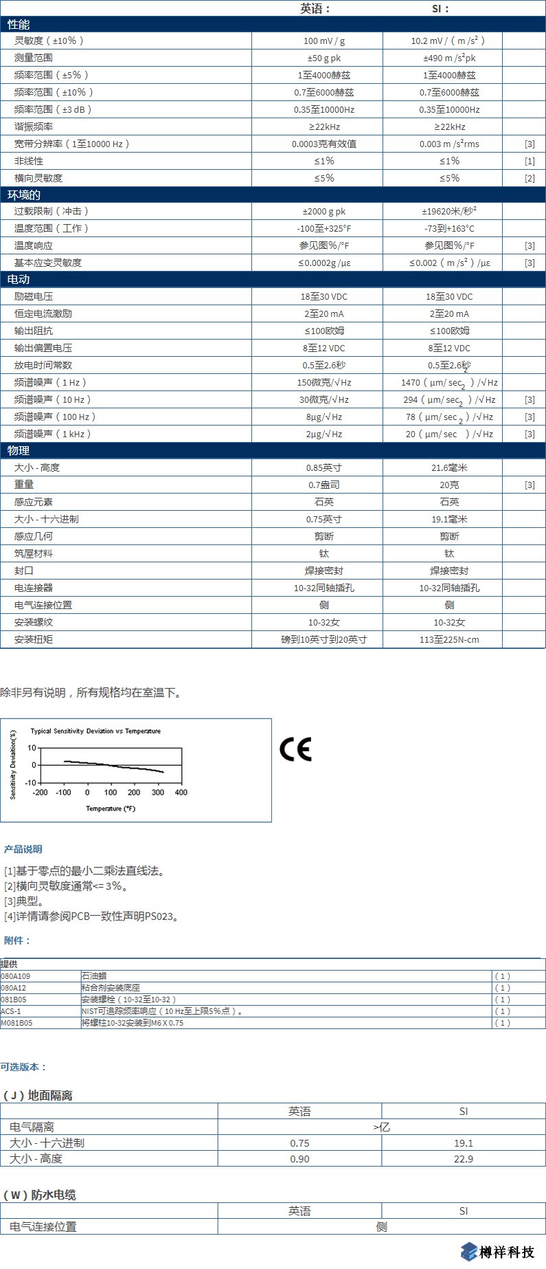 美國進口PCB單軸加速度振動傳感器320C33型,ESS高靈敏度,石英剪切ICP?加速,100 mV / g,1至4k Hz,10-32側連接,至+325?F / + 163?C靈敏度:(±10%)100 mV / g(10.2 mV /(m /s2))測量范圍:±50 g pk(±490 m /s2pk)寬帶分辨率:0.0003 g rms(0.003 m /s2rms)頻率范圍:(±5%)1至4000 Hz感應元素:石英。