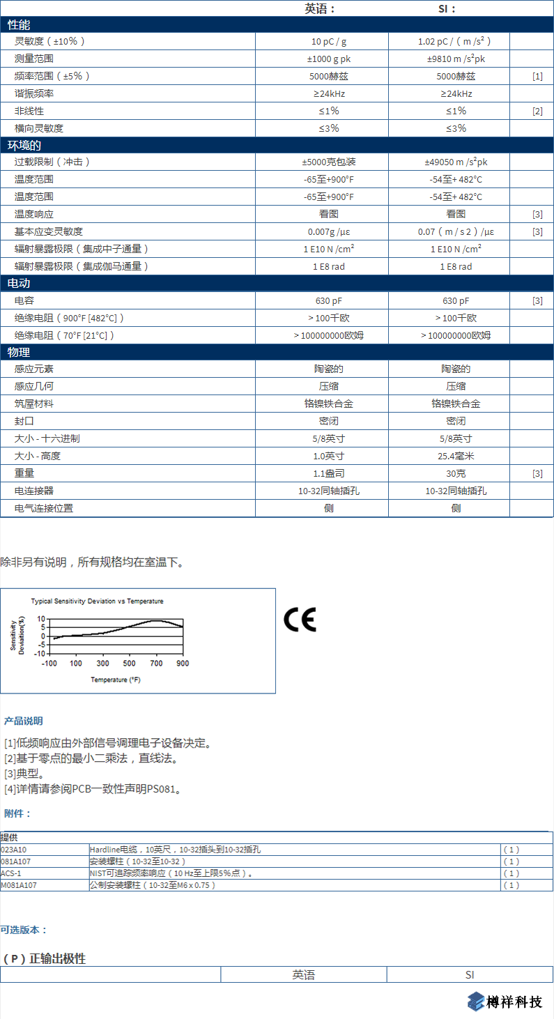 美國進口PCB單軸加速度振動傳感器357B61型,高溫,陶瓷壓縮,電荷輸出加速,10 pC / g,5kHz,10-32側連接。(-65°F至+ 900°F),配有10英尺硬線電纜靈敏度:(±10%)10 pC / g(1.02 pC /(m /s2))測量范圍:±1000 g pk(±9810 m /s2pk)頻率范圍:(±5%)5000 Hz重量:1.1盎司(30克)。