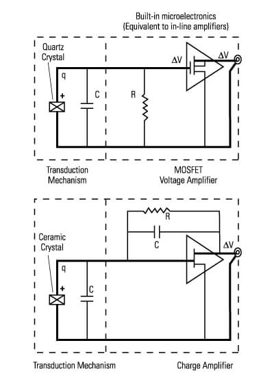 ICP®傳感器通常使用兩種類型的集成電路:電壓放大器和電荷放大器。低電容石英傳感元件具有非常高的電壓輸出(根據V = q / C),通常與MOSFET電壓放大器一起使用。具有非常高的電荷輸出的陶瓷傳感元件通常耦合到電荷放大器。